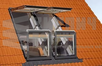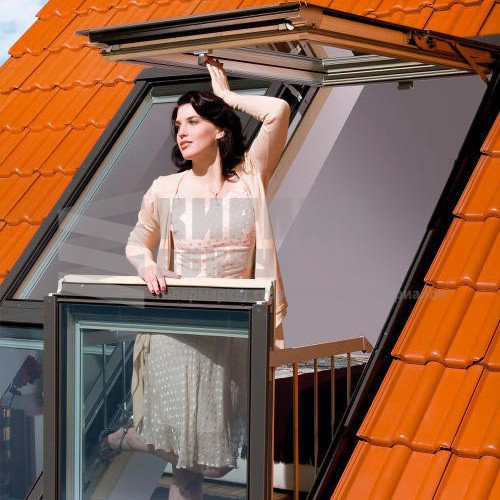 Окно-балкон FAKRO FGH-V P2 Galeria – двустворчатое мансардное окно, верхняя створка которого может открываться независимо от нижней, выполняя функции обычного окна для крыши, а при открывании нижней створки образуется дополнительное пространство, и окно трансформируется в балкон.
